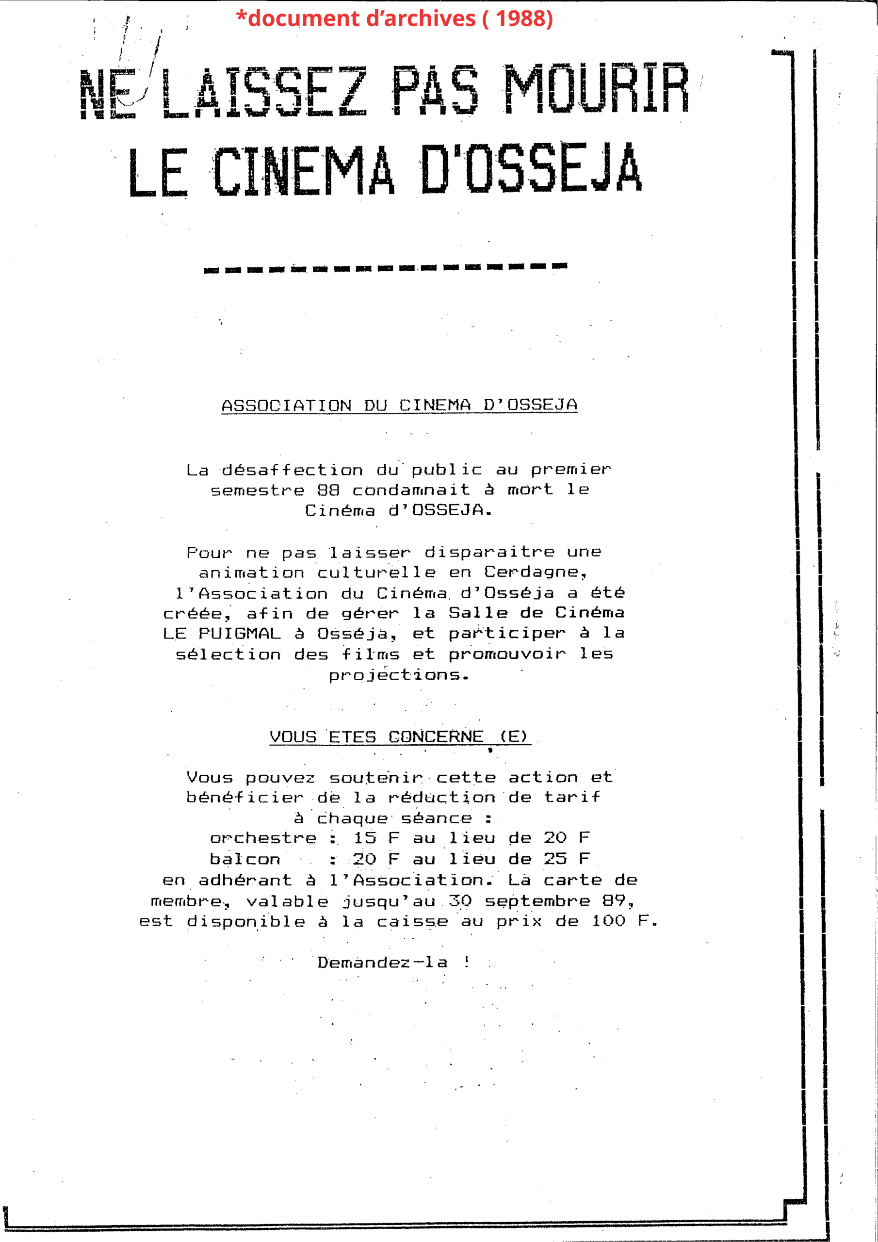 Le 1er octobre 1988, le cinéma d’Osséja connaît un nouveau tournant avec la création de l’association cinéma Le Puigmal, fondée par Monsieur François Clouet. Il est accompagné dans cette initiative par Monsieur Daniel Delestré, qui jouera un rôle central dans la gestion et l’animation de la structure.